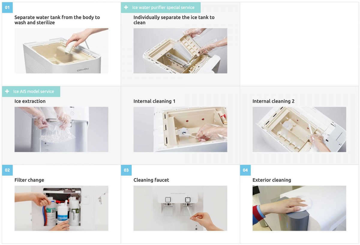 The water tank and water paths are serviced in detail through the use of a specialized water purifier sanitation kit during Coway Lady’s maintenance visits.