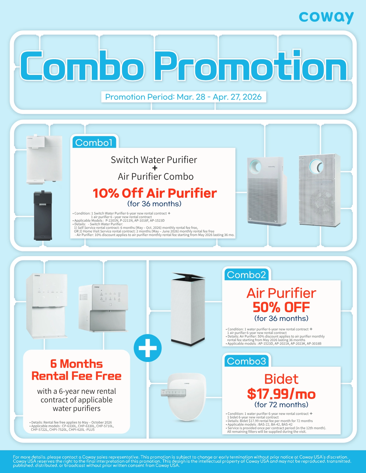 Water can contain dirt, minerals, chemicals and other impurities that can cause bad odor and taste. Some of these contaminants can endanger one’s health. Coway provides the most reliable filtering system with every filter certified by WAQ.